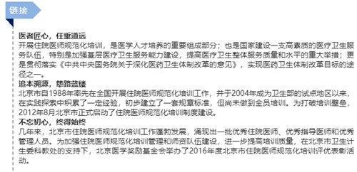 开展住院医师规范化培训,是健康产业医疗领域人才培养的重要组成部分,北京医学奖励基金会作为国内有影响力的医学类专业基金会,以推进健康中国建设为行动纲领,以住院医师规范化评选表彰活动为契机,推进北京市医学事业的发展。