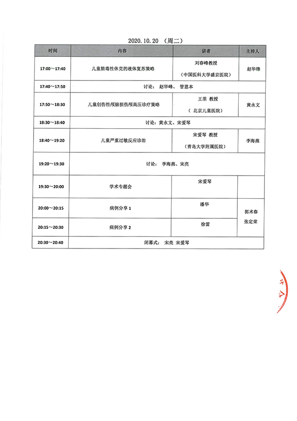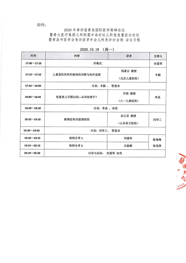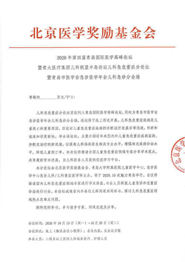 2020年第四届青岛国际医学高峰论坛 暨青大医疗集团儿科联盟半岛论坛儿科急危重症分论坛暨青岛市医学会急诊医学年会儿科急诊分会场