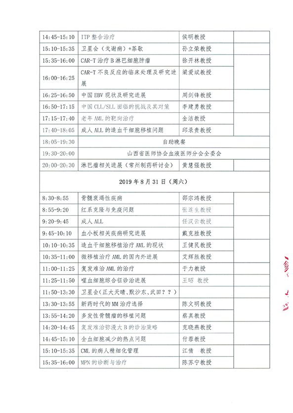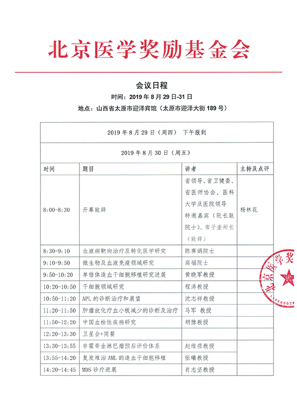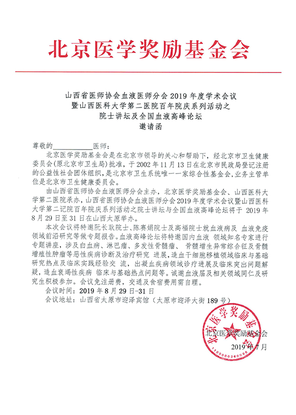 邀请函-山西省医师协会血液医师分会2019年度学术会议暨山西医科大学第二记院百年院庆系列活动之院士讲坛与全国血液高峰论坛