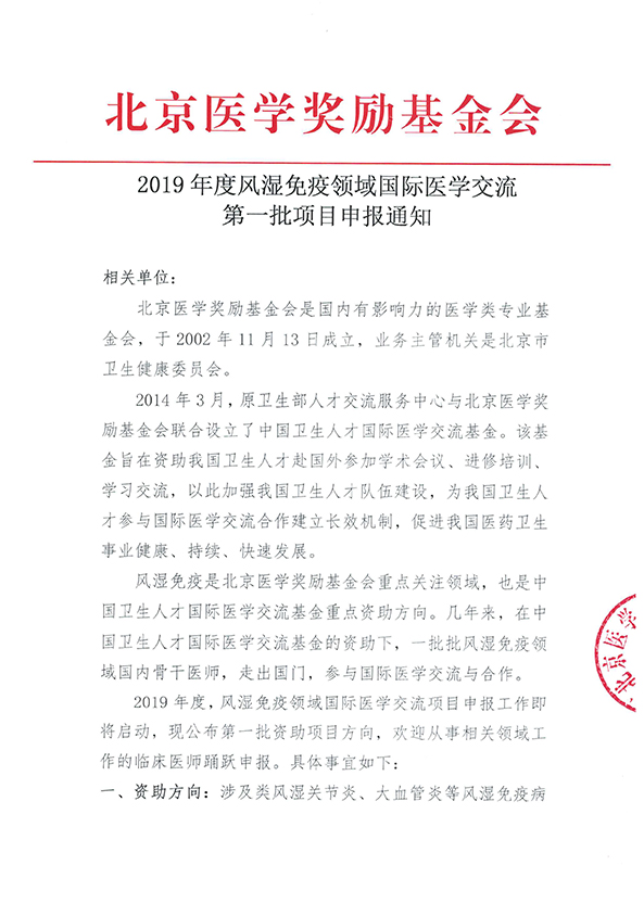 2019年度风湿免疫领域国际医学交流第一批项目申报通知
