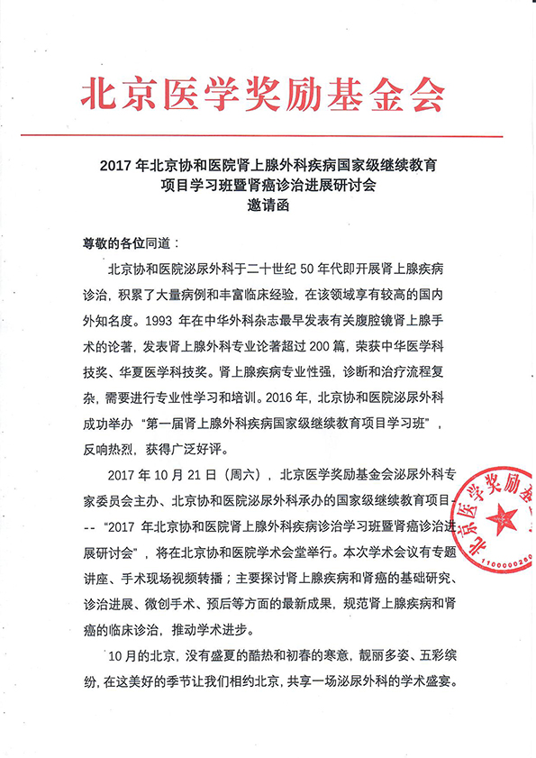 2017年北京协和医院肾上腺外科疾病国家级继续教育项目学习班暨肾癌诊治进展研讨会-邀请函