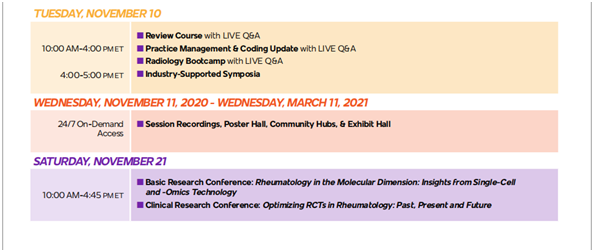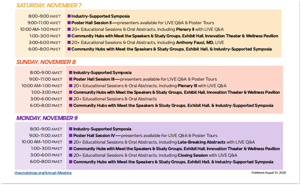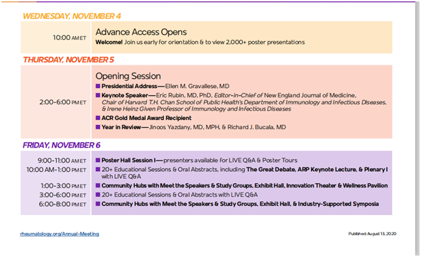 2020年11月5至11月10日,2020年美国风湿病学会(ACR)年会将在线上举办。美国风湿病学会年会(ACR)是世界上最大、最负盛名的的风湿病学会议,每年都有来自全球100多个国家的16000余名代表参会,ACR年会是风湿病学领域的学者和医生获取最新风湿病学研究与临床应用信息的重要平台。ACR通过提供有意义的教育、研究、宣传和实践支持来促进其成员发展。