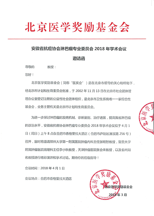 安徽省抗癌协会淋巴瘤专业委员会2018年学术会议邀请函
